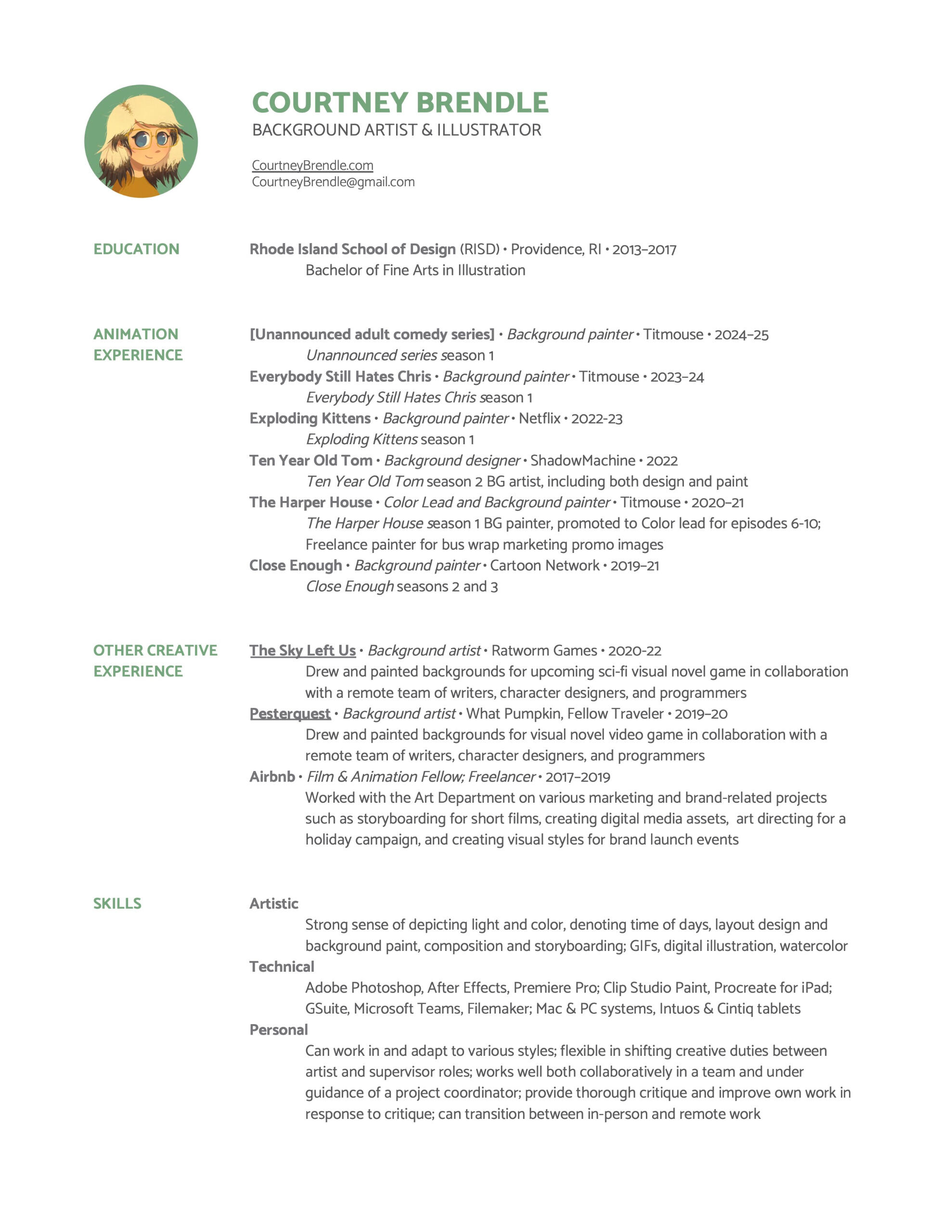 Courtney (aka Courtdraws) is an illustrator currently working as a background painter in Los Angeles. Past work clients include Cartoon Network, Netflix, Titmouse, ShadowMachine, Airbnb, and What Pumpkin. She also enjoys selling artwork at local events and artist alleys.Courtney is a RISD '17 illustration grad, originally from Maryland. She also enjoys chocolate, cats, climbing, and winding down with the best 24/7 lofi hip hop radio chill beats to relax/study to on Youtube.